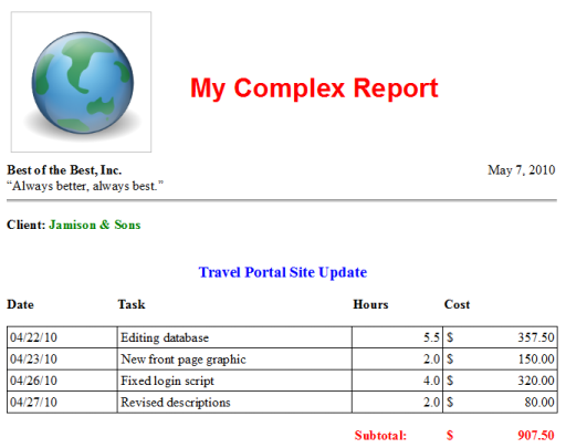 WordReport creates reports on the fly. With images, optional replacements, loops, text styles, and Unicode, plus any formatting you can imagine in your template files, it's a full-featured report solution!